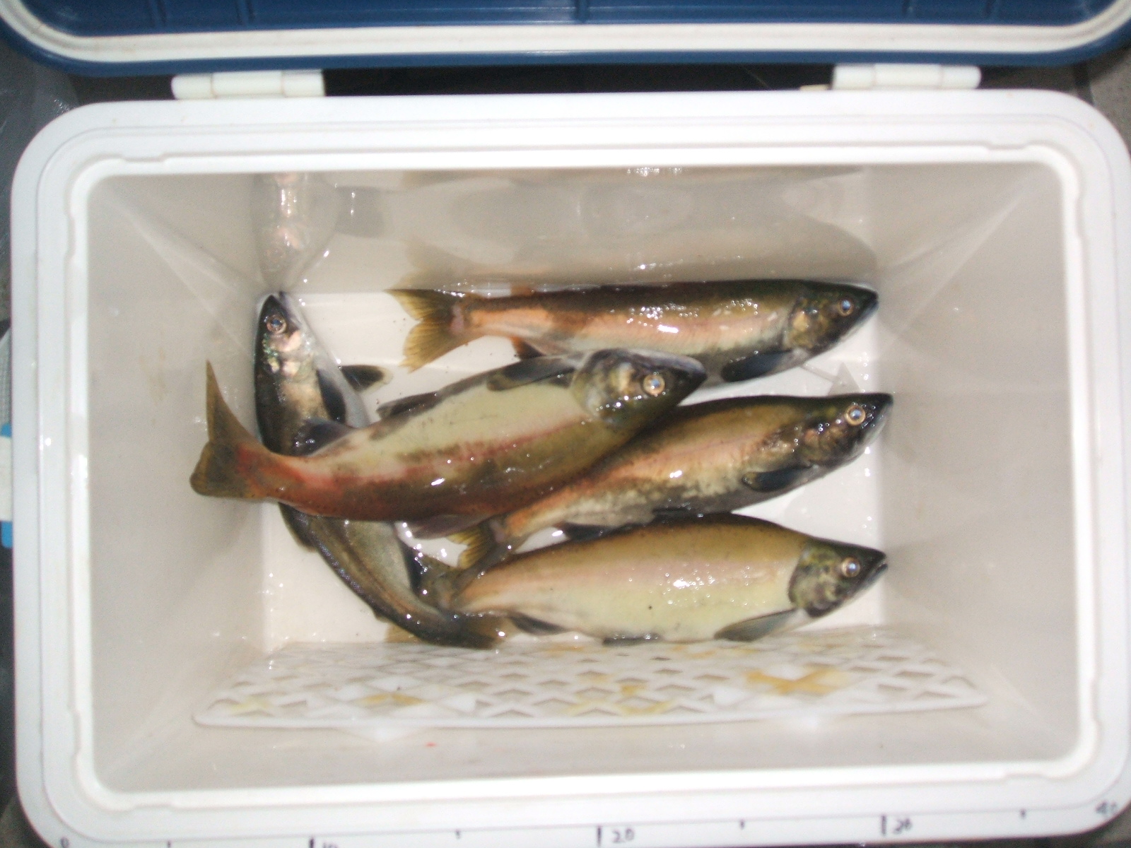 Cooler Boxの底長が35cm。3時間半の釣果は、婚姻色が出始めた雄4尾・雌1尾。