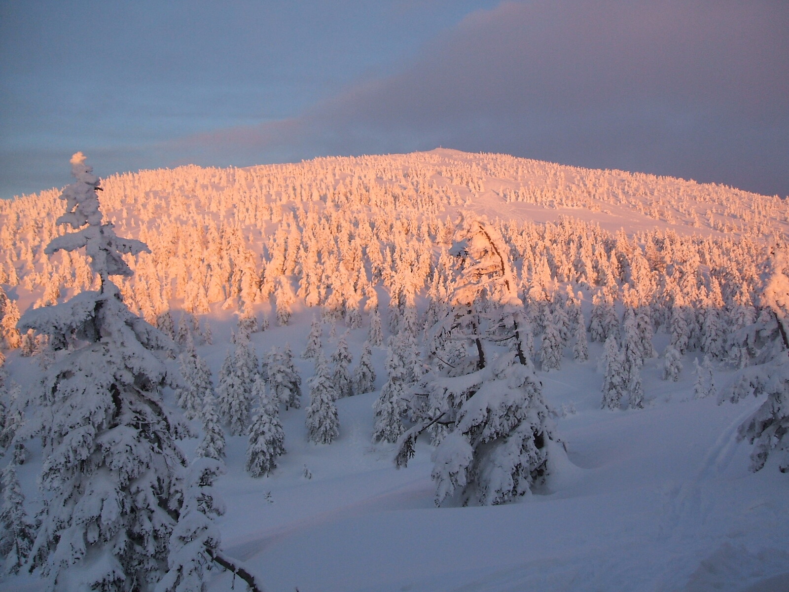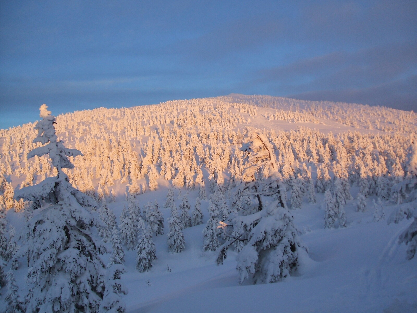 硫黄ルートを登って行くと・・青森トド松が雪の鎧を纏ってるが、樹氷未満・・・