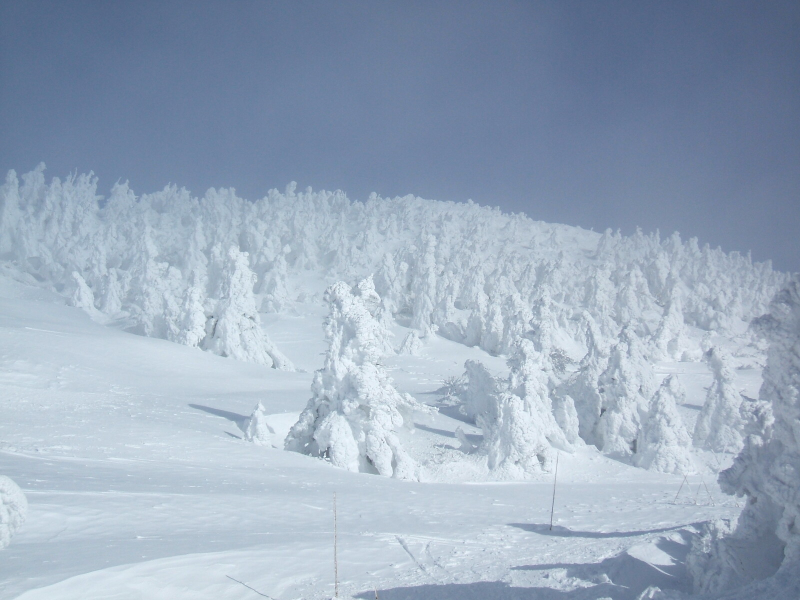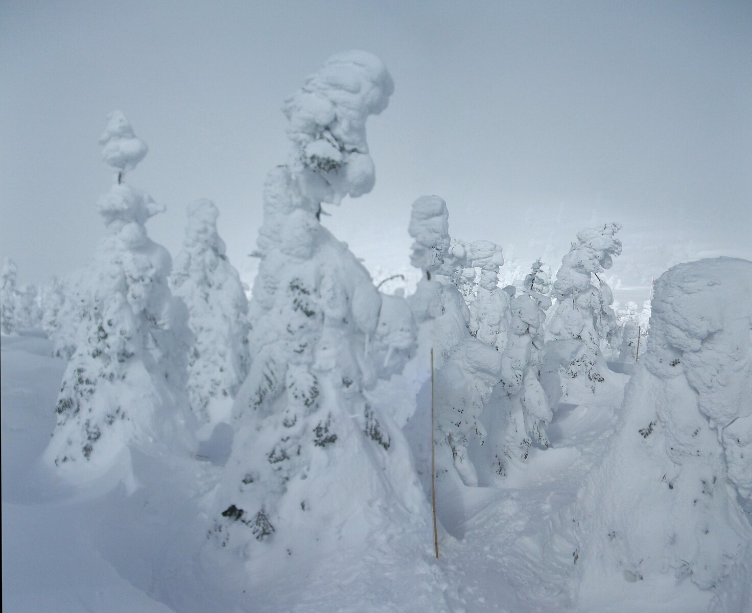 小屋から暫くは、平坦な樹氷原を・・・竹ポールが立ってました・・・有り難い。