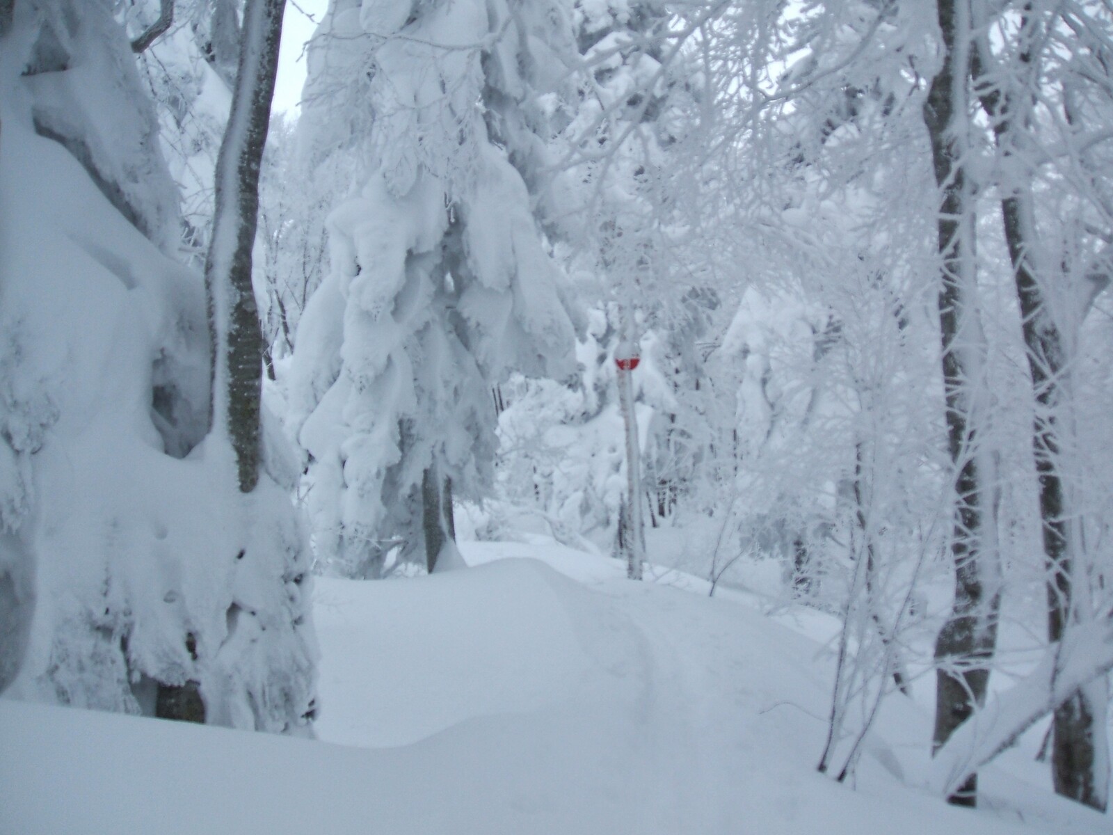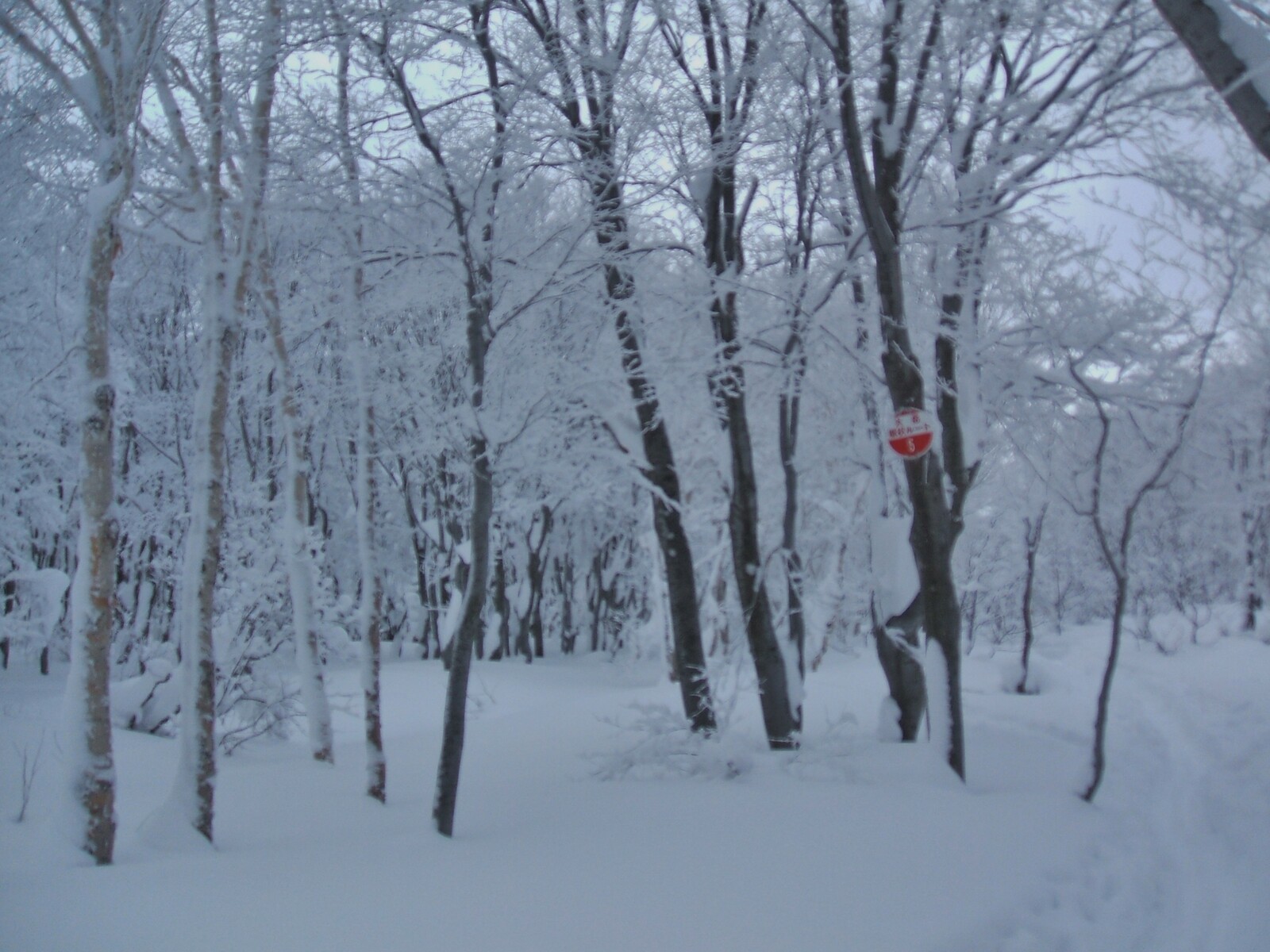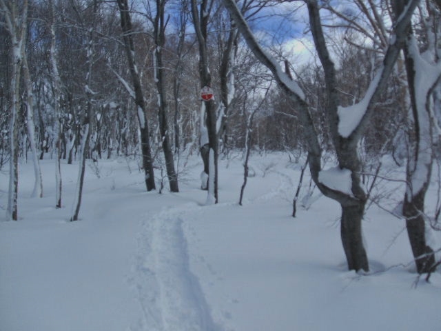 山スキーツァー用の標識①番。降雪が少ないので、トレールがバッチリ残ってます。