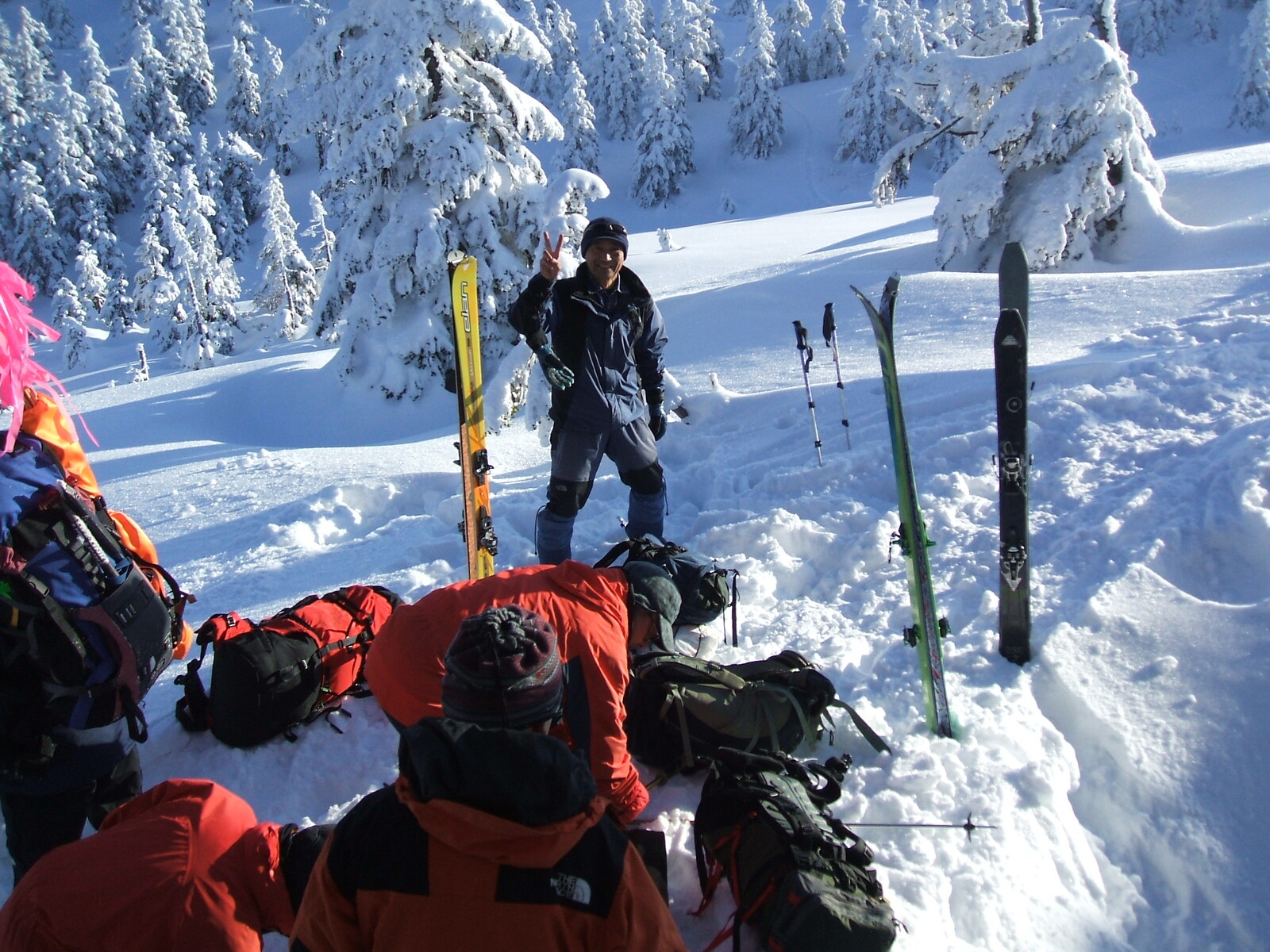 地獄湯の沢出合いです。ここで板を外して一本、沢を登るか? 硫黄ルートを登るか?