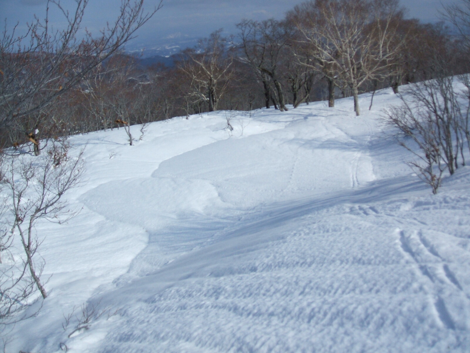 シールを外して毛無岱避難小屋へ滑り、中央ルートを横切って下毛無岱からカモシカへ。