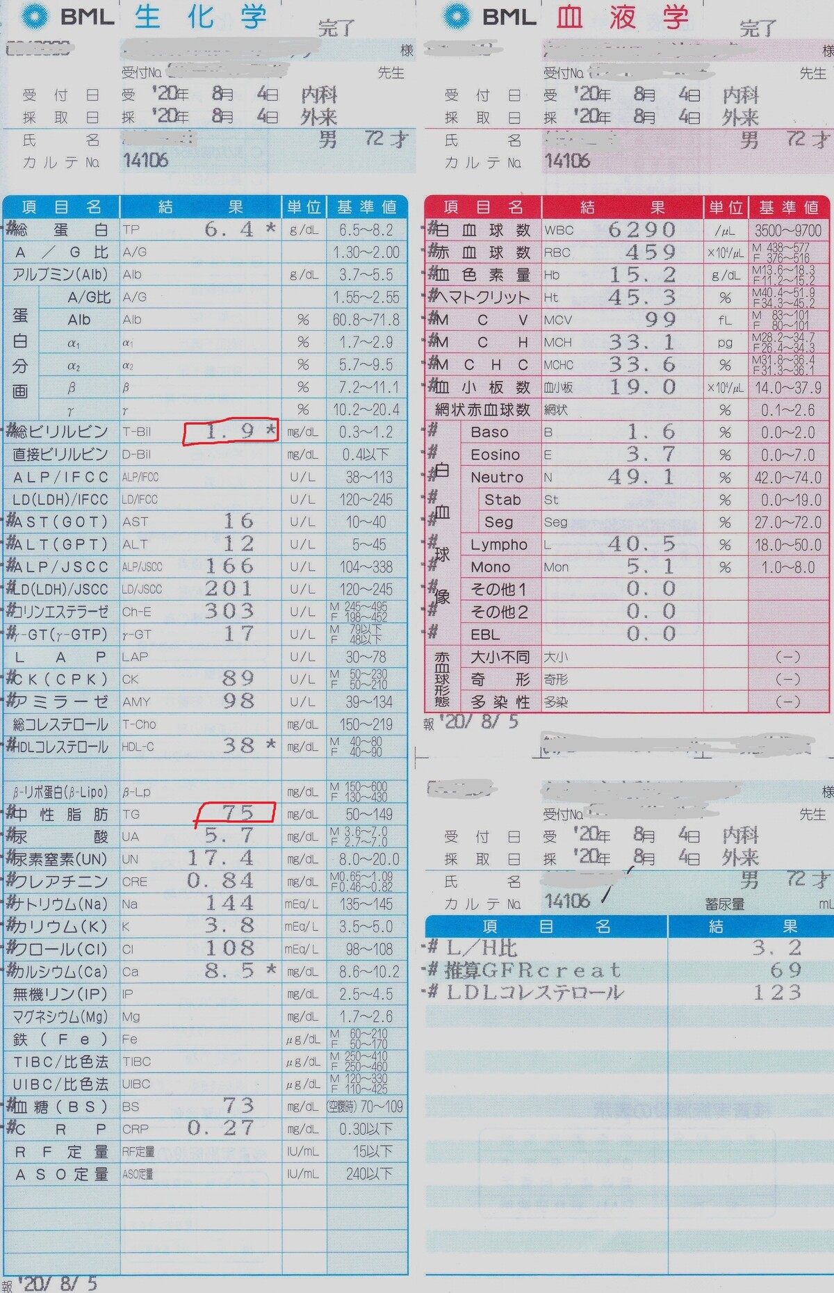 約1年前の、'19年9月の血液検査のデータ。これと同時に、尿検査もしたが異常なし。