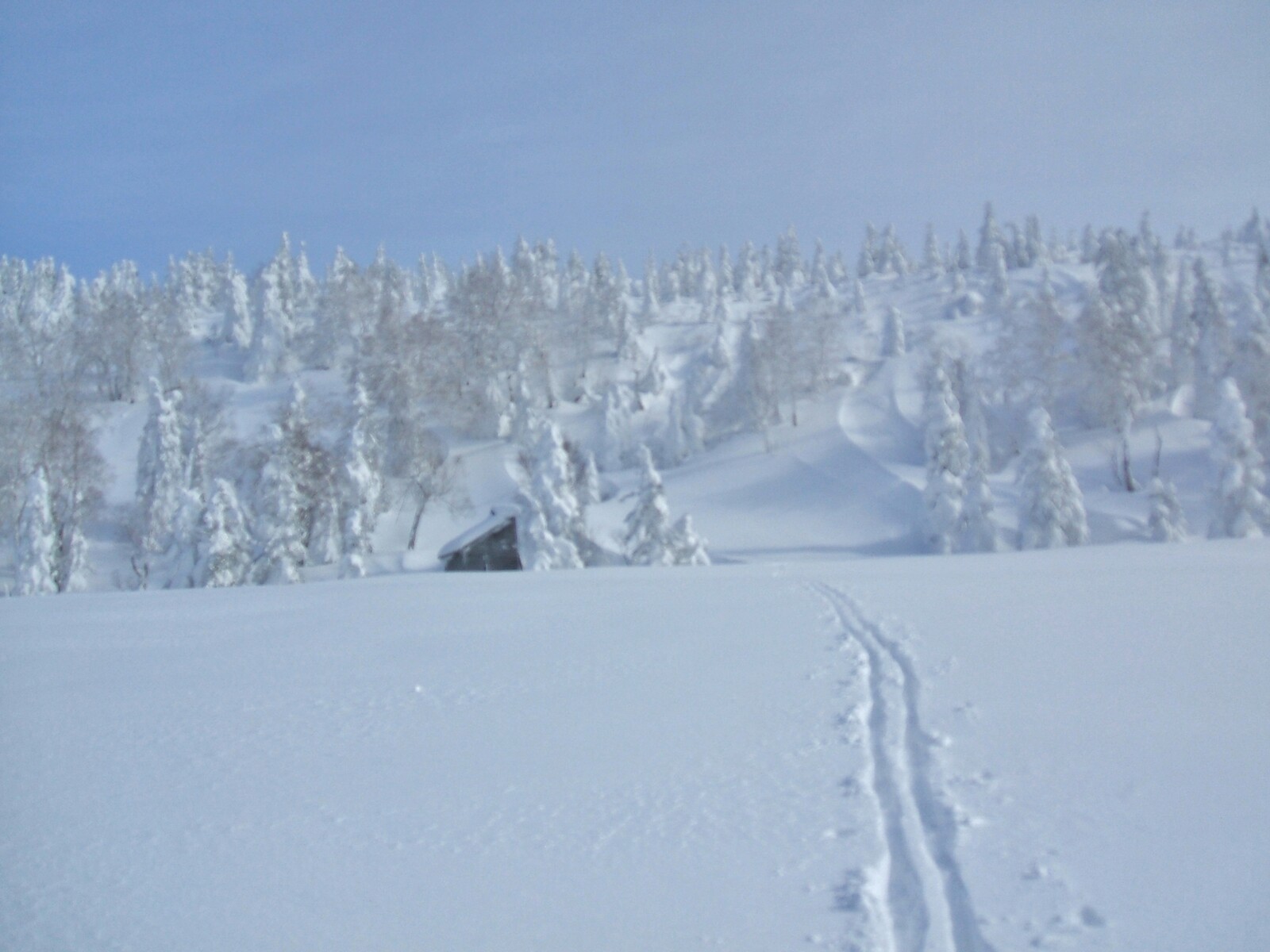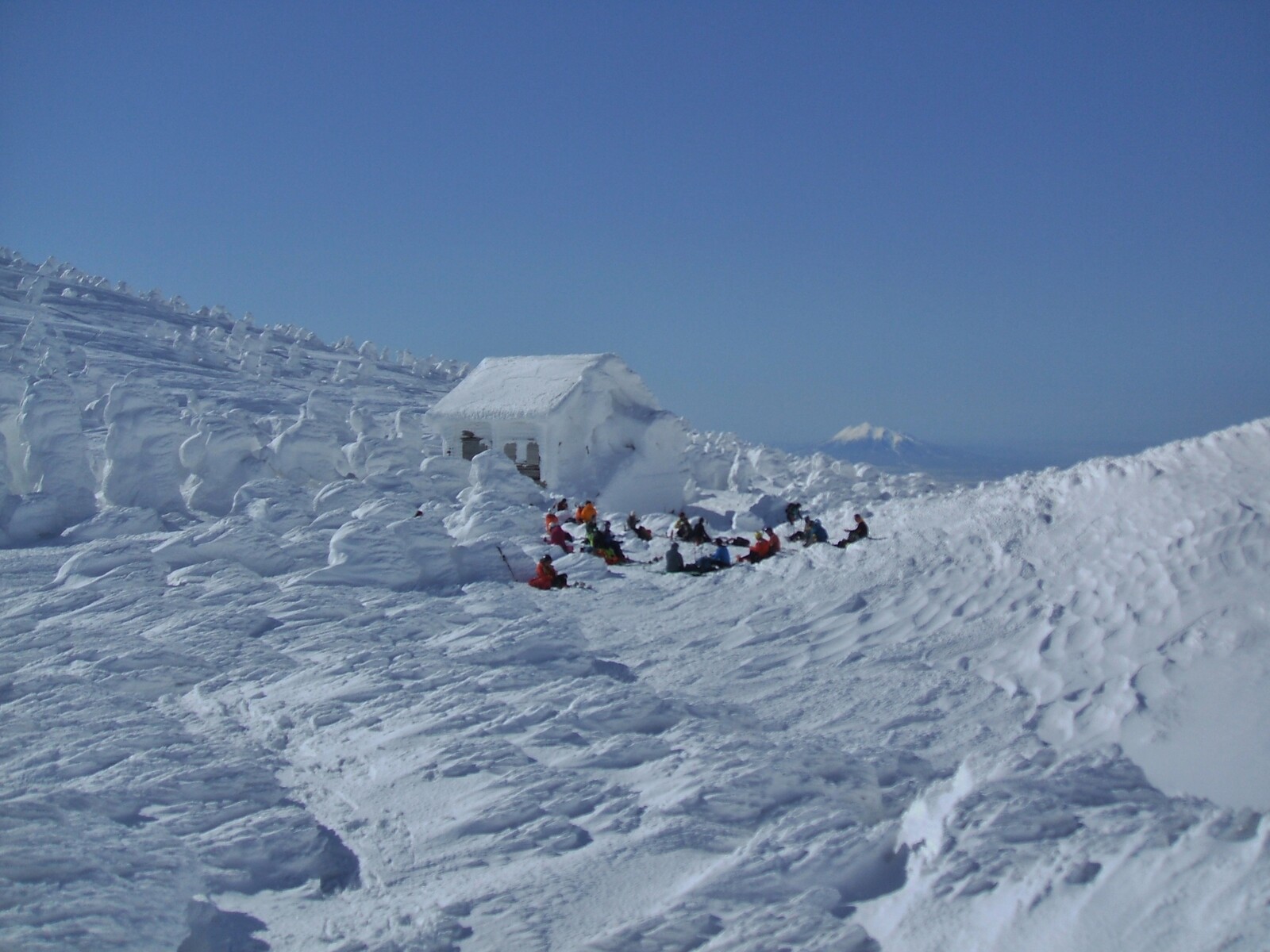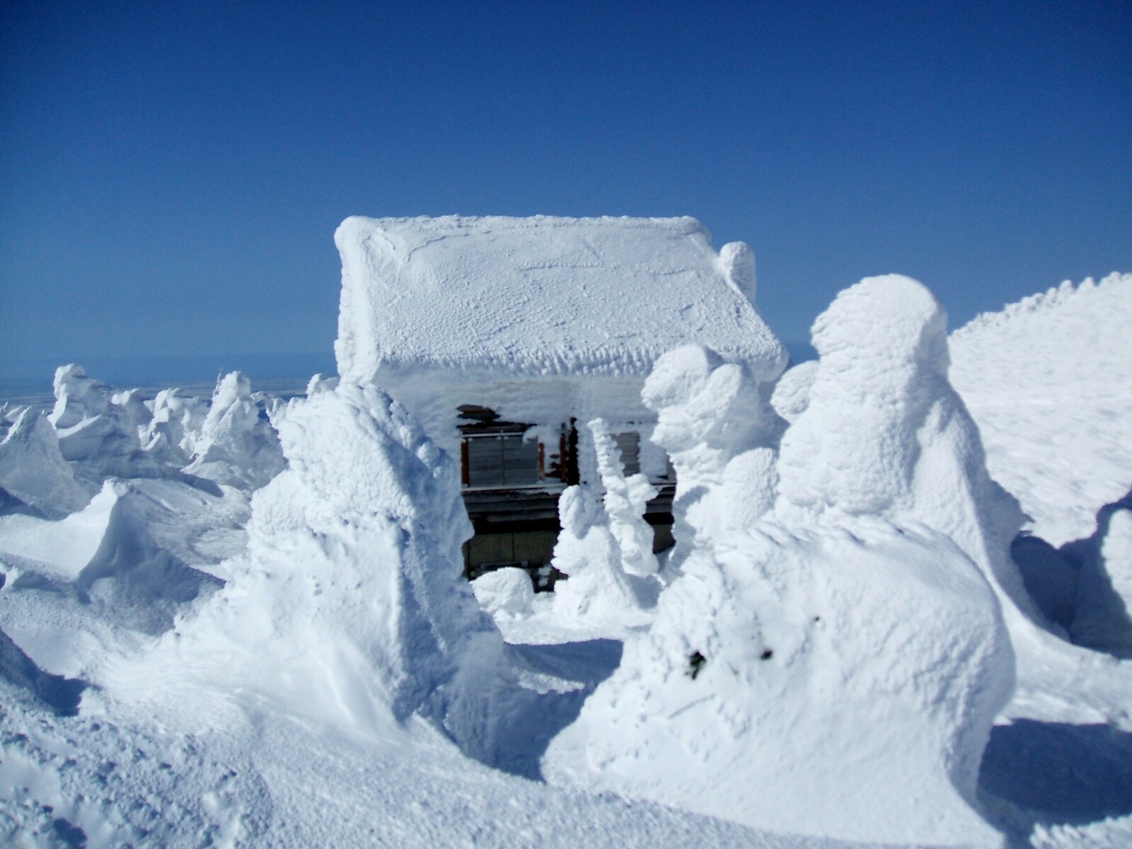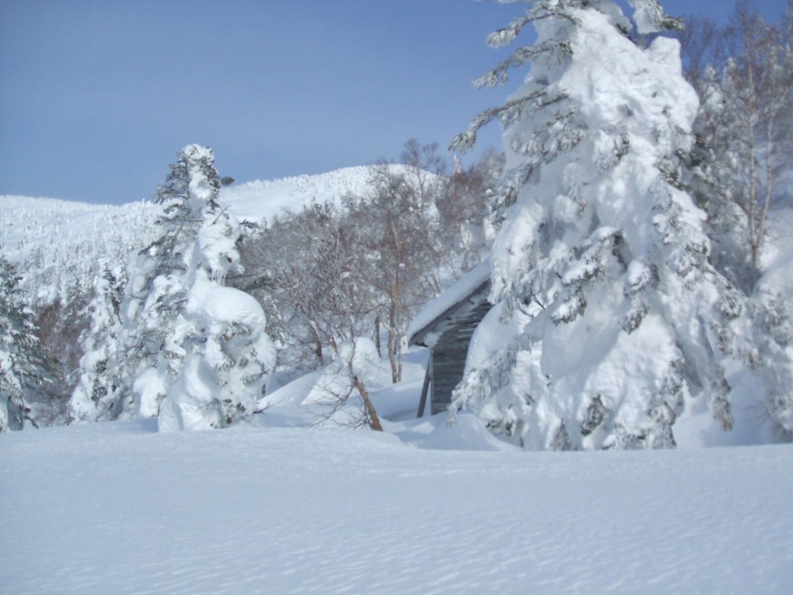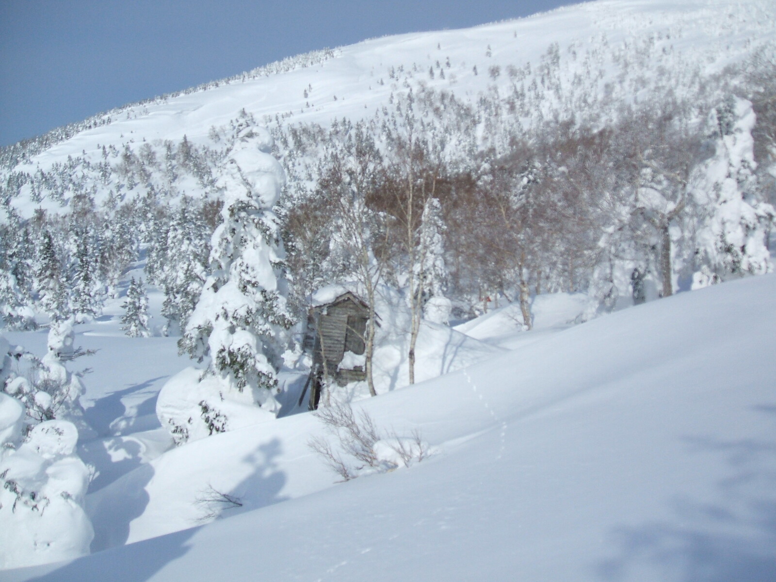 阿仁避難小屋(1311m)に着いた。右の冬用出入り口が、吹き溜まりで埋まってる・・・