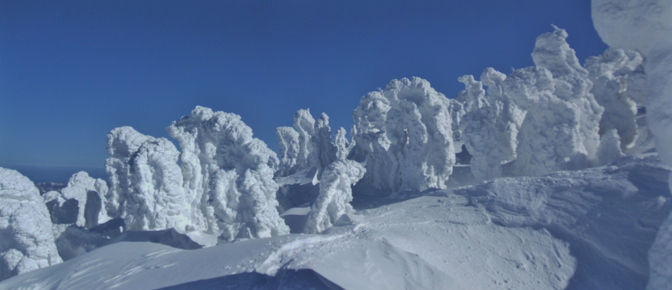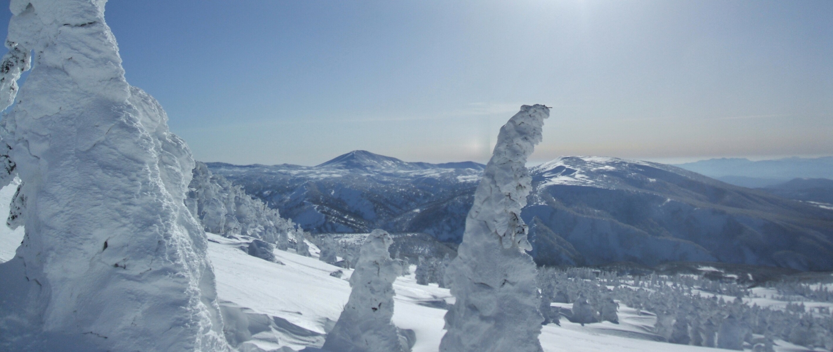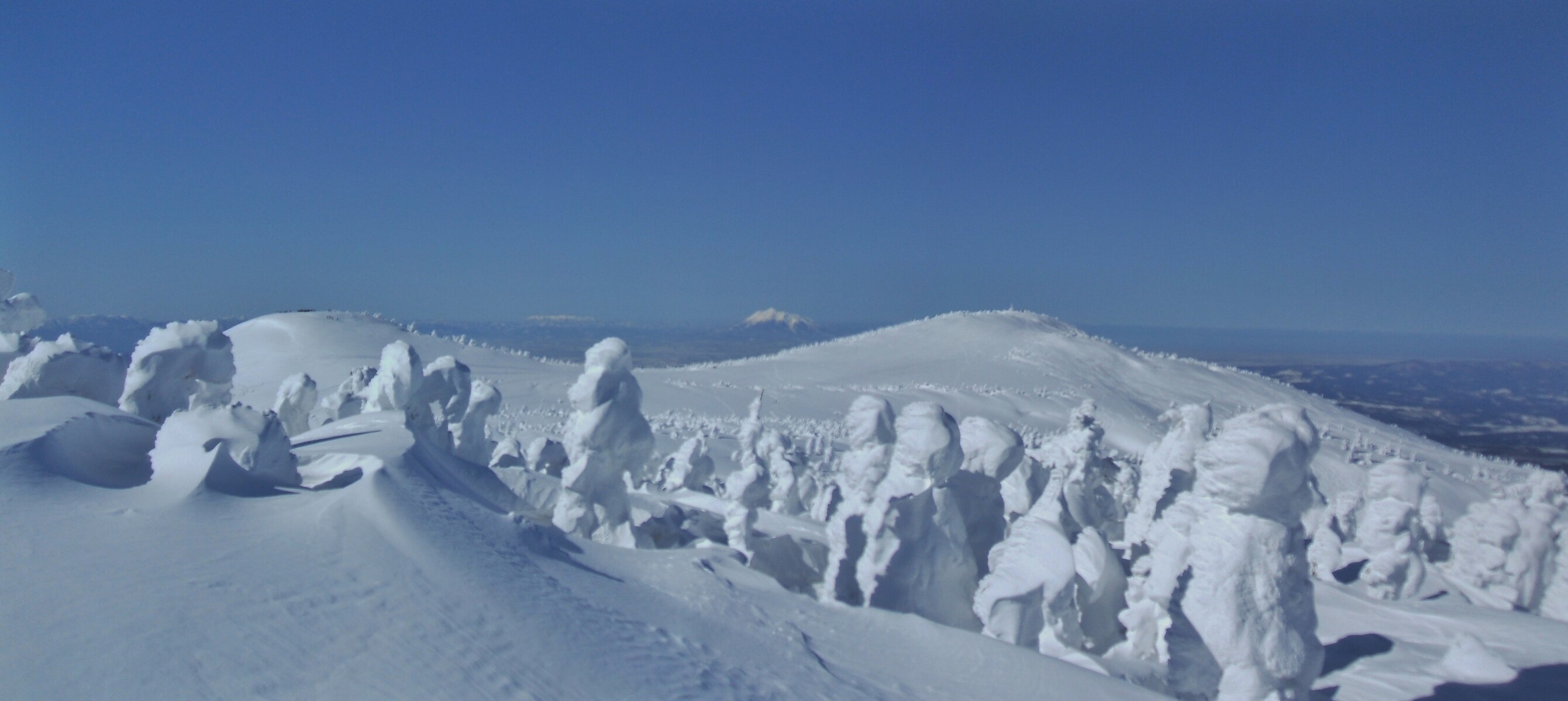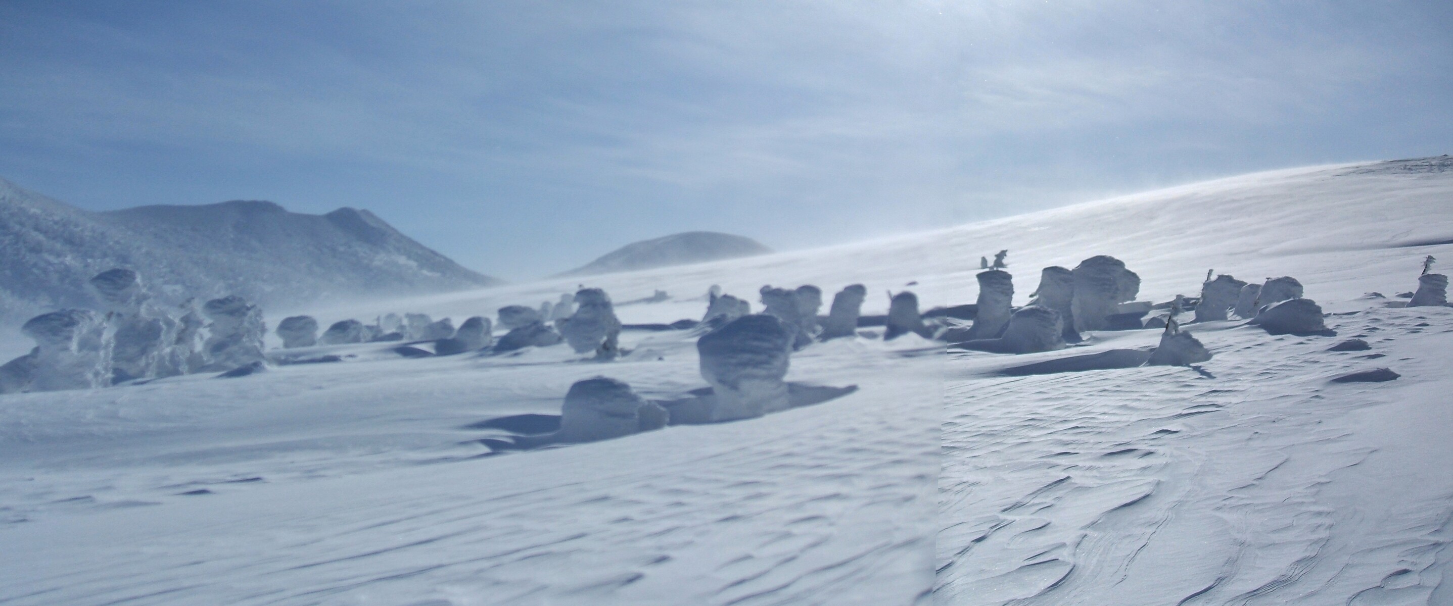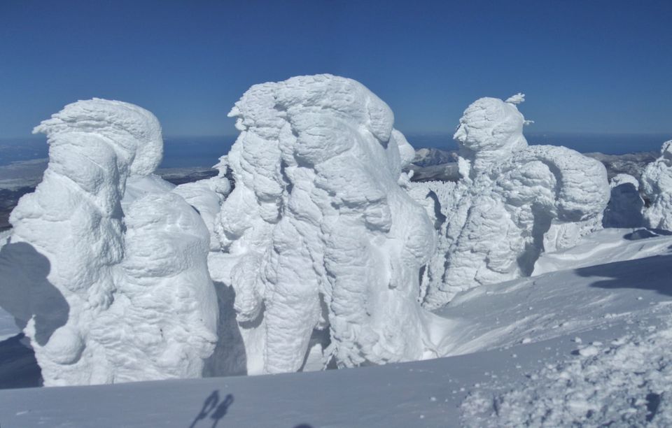山頂にはガスが掛かり、樹氷も先の爆弾低気圧のお陰で落ちてしまってる・・・