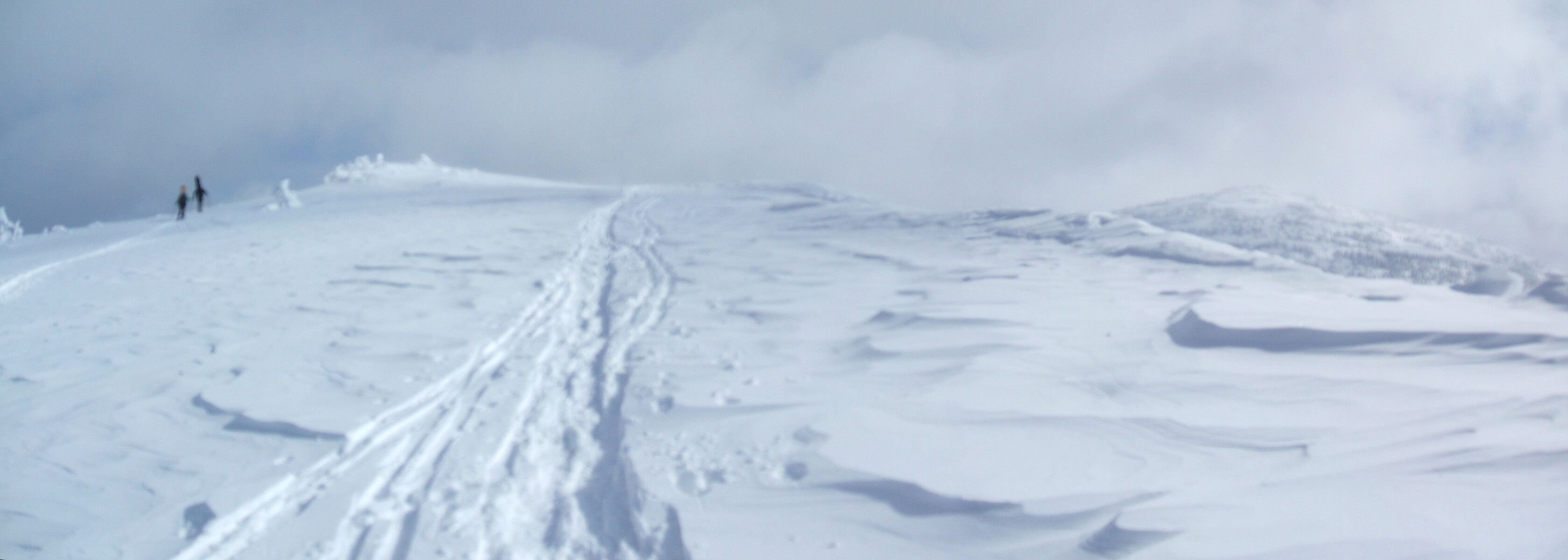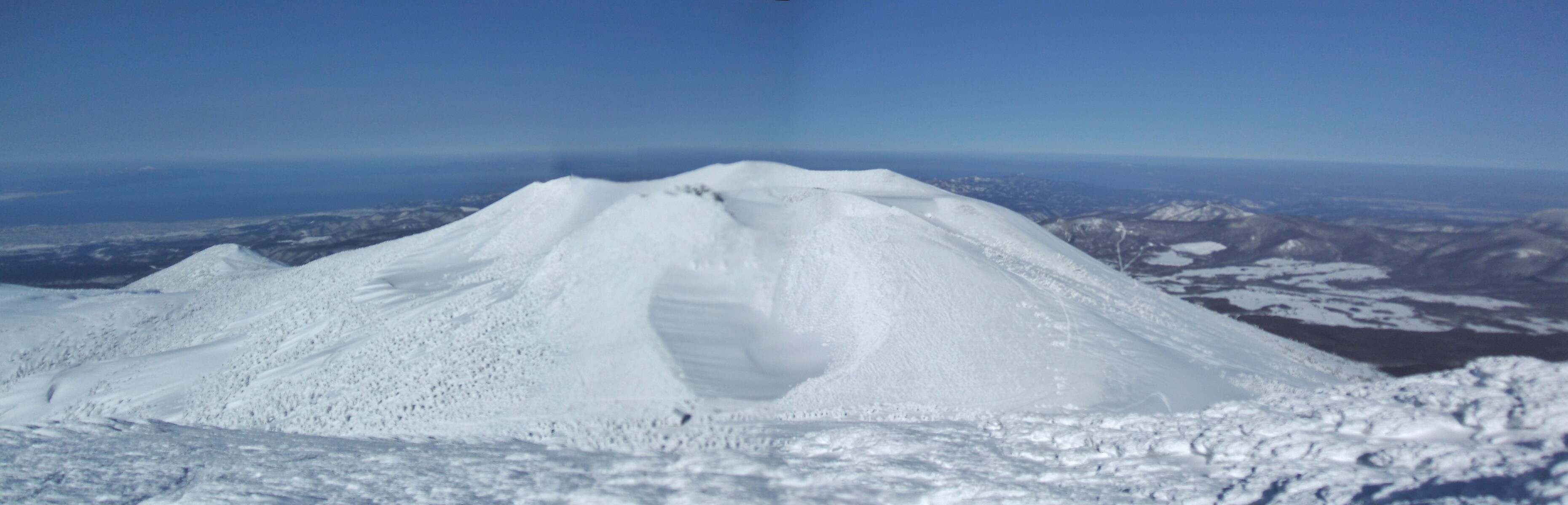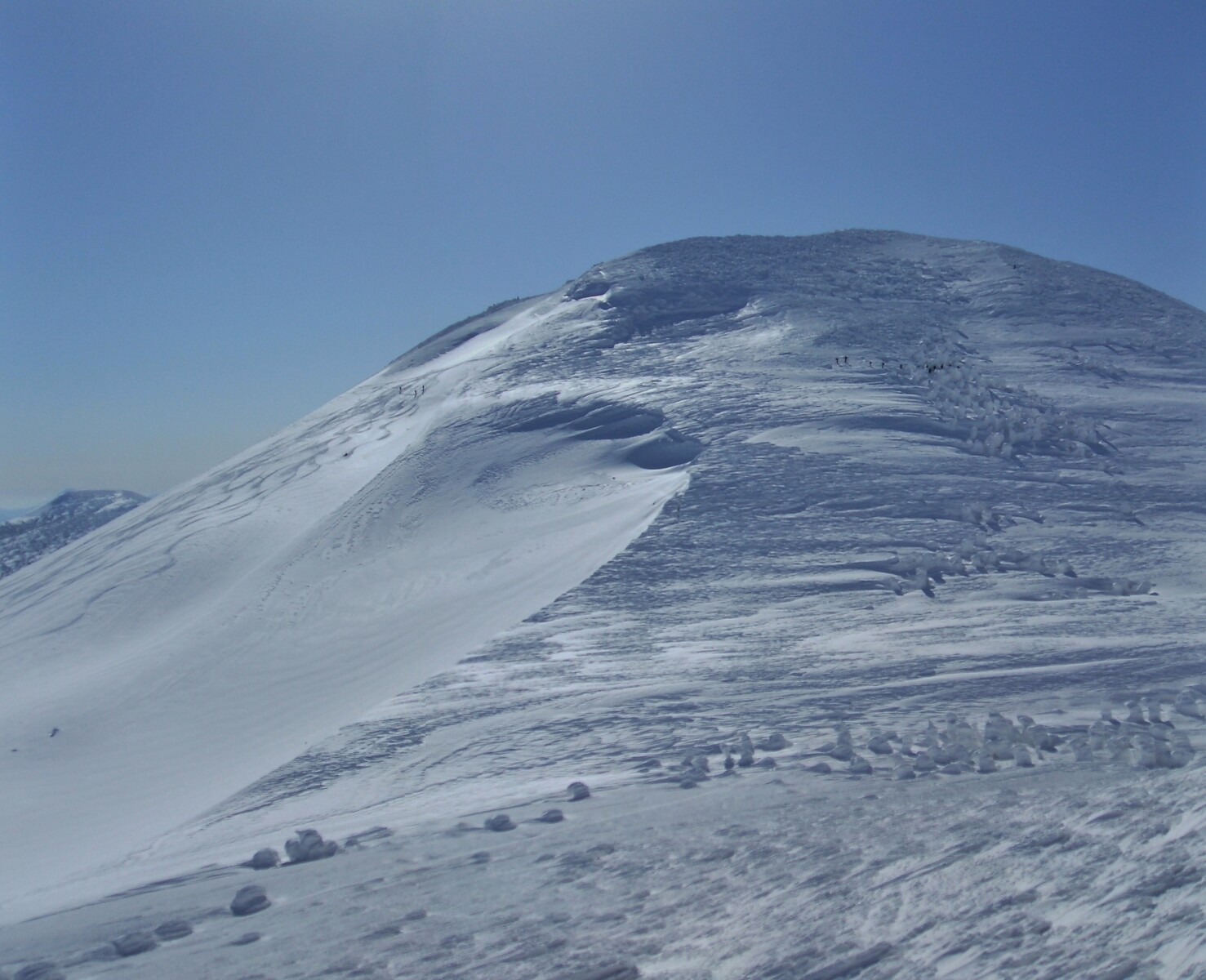 北から風が強烈に冷たく、フードを被る。左の尾根に森吉避難小屋・神社が見える・・・