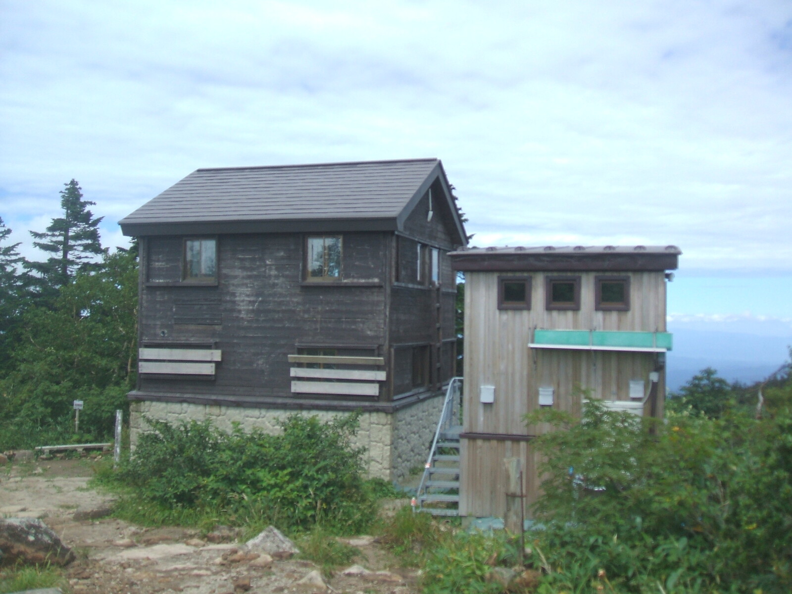 石森Pから、森吉避難小屋へ・・・小屋の後ろに神社の屋根が・・・冠岩も。