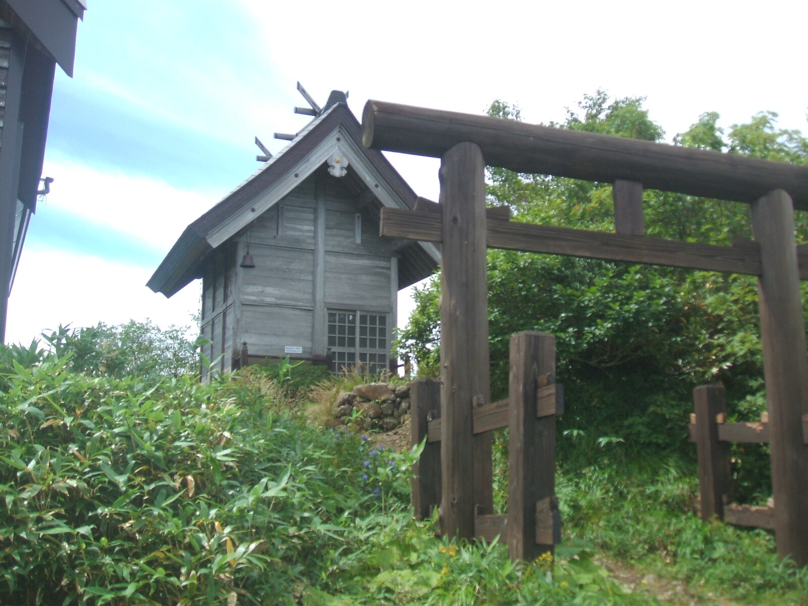 冠岩の前に、森吉神社が鎮座。鳥居の桁が、熊に齧られてる・・・熊が多い場所だ。