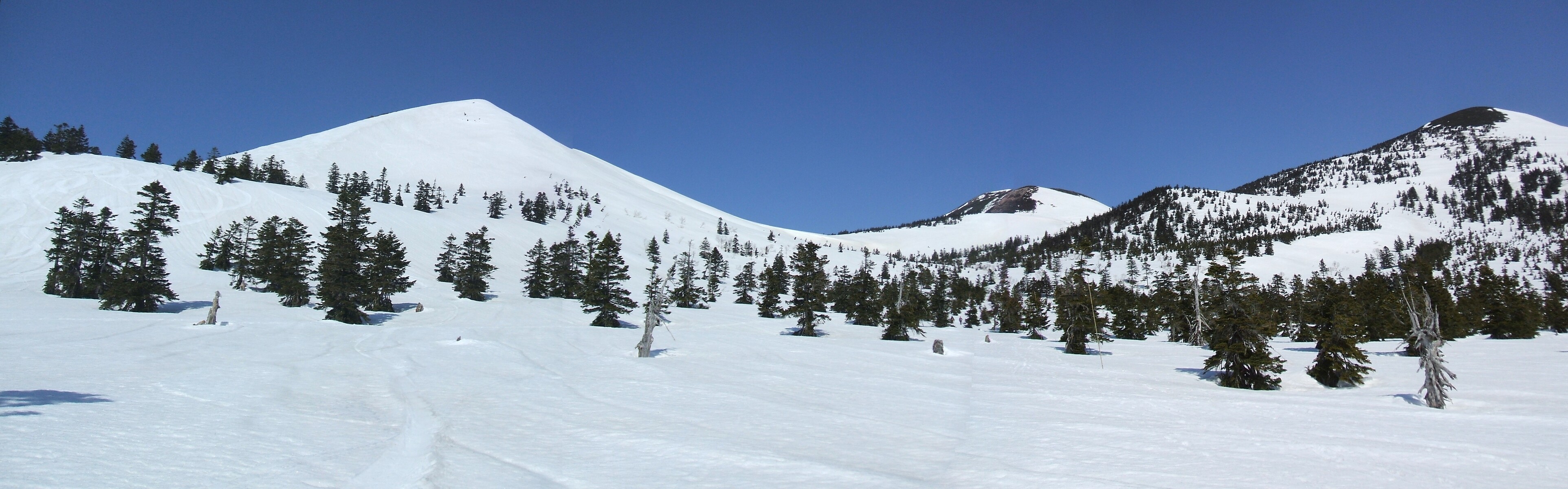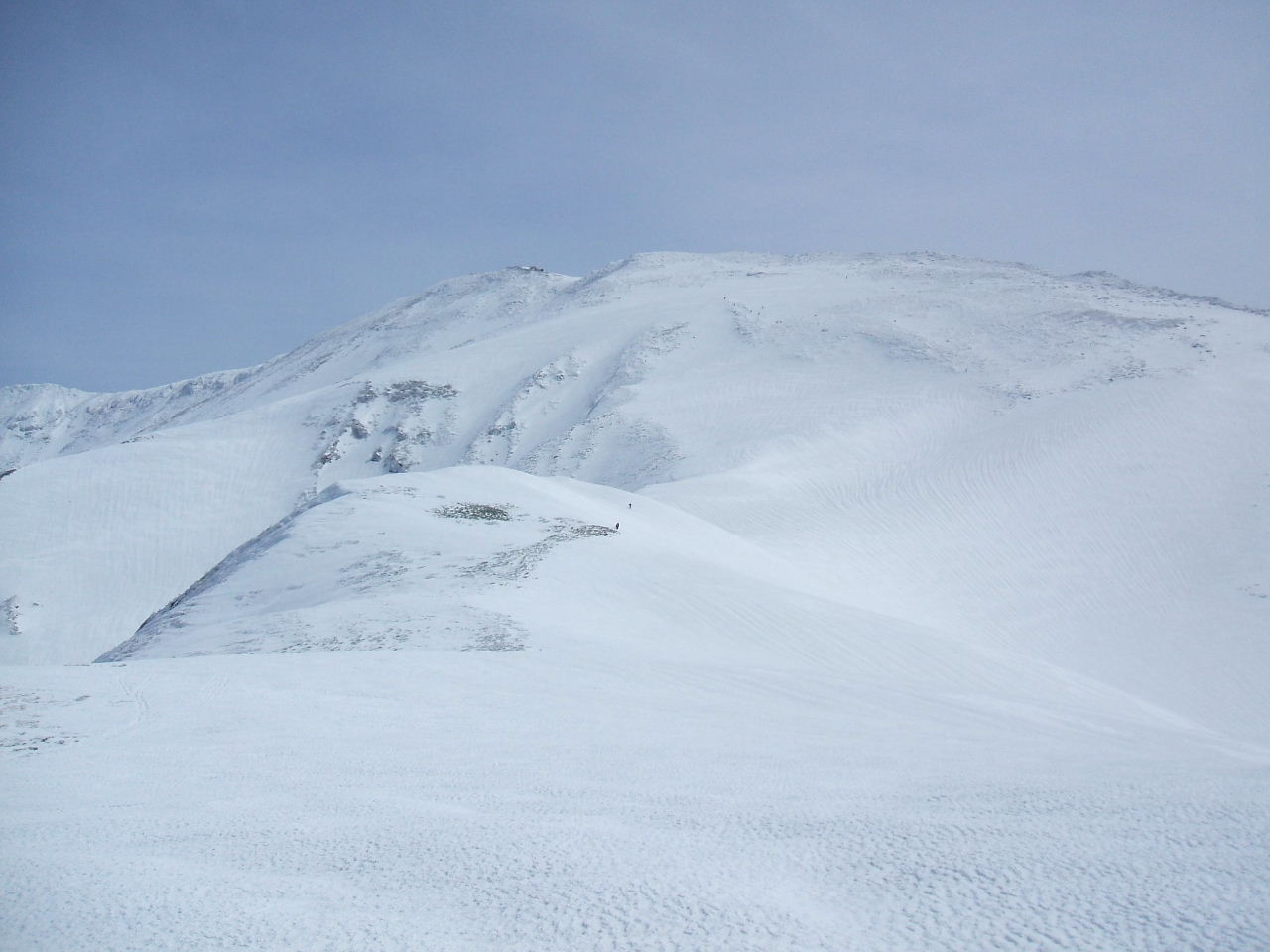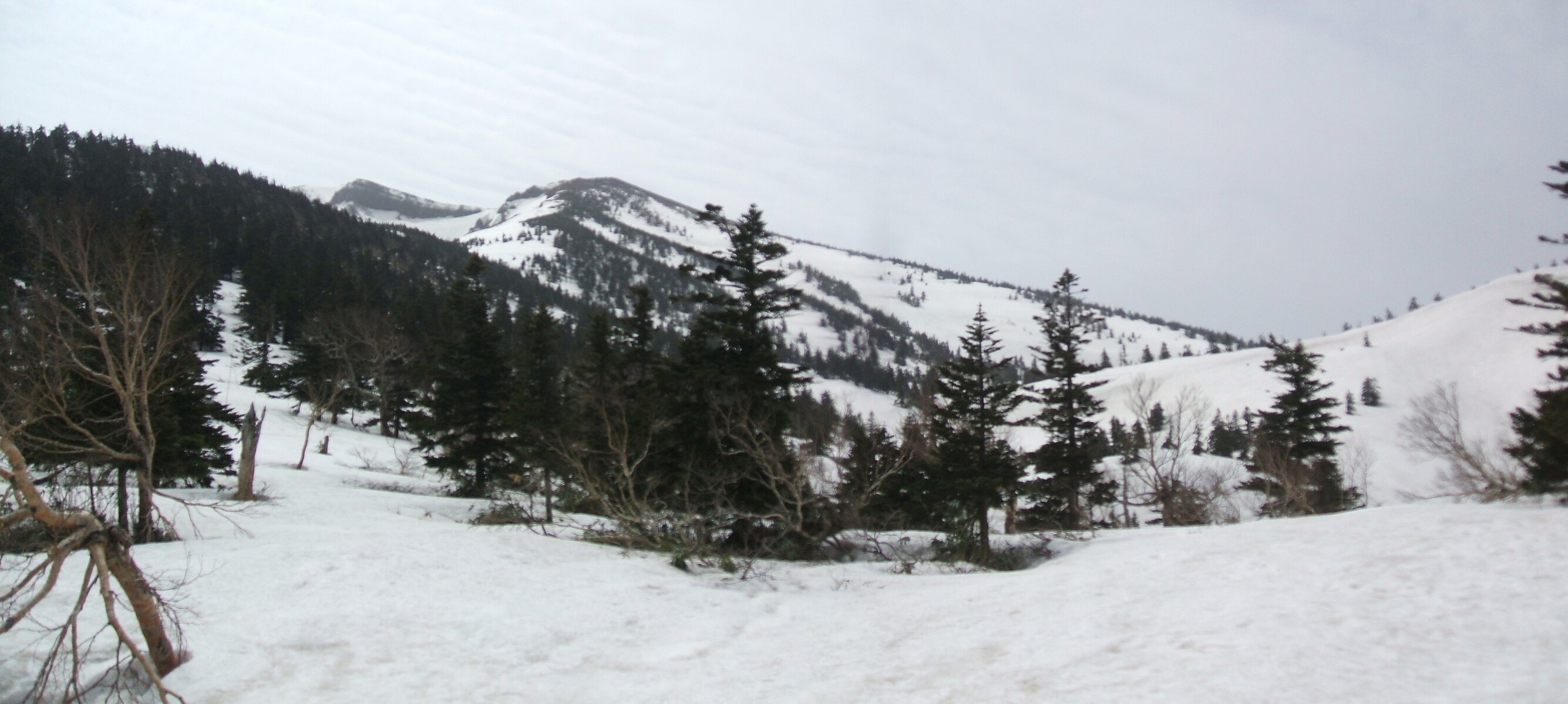 東に小岳と奥に高田大岳。これも山頂部に雪無し・・・