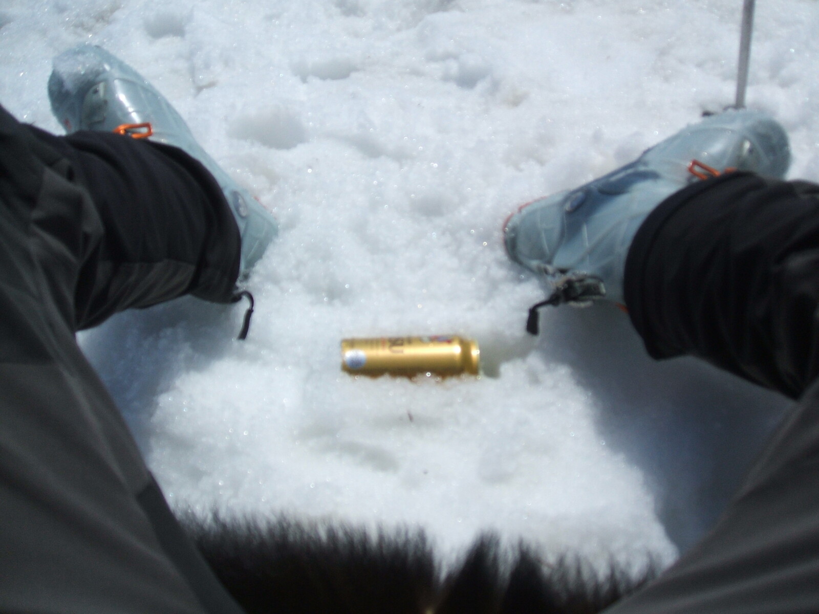 小屋脇でパンを喰う・・・ブシューをコロコロして、キンキンに冷やす。