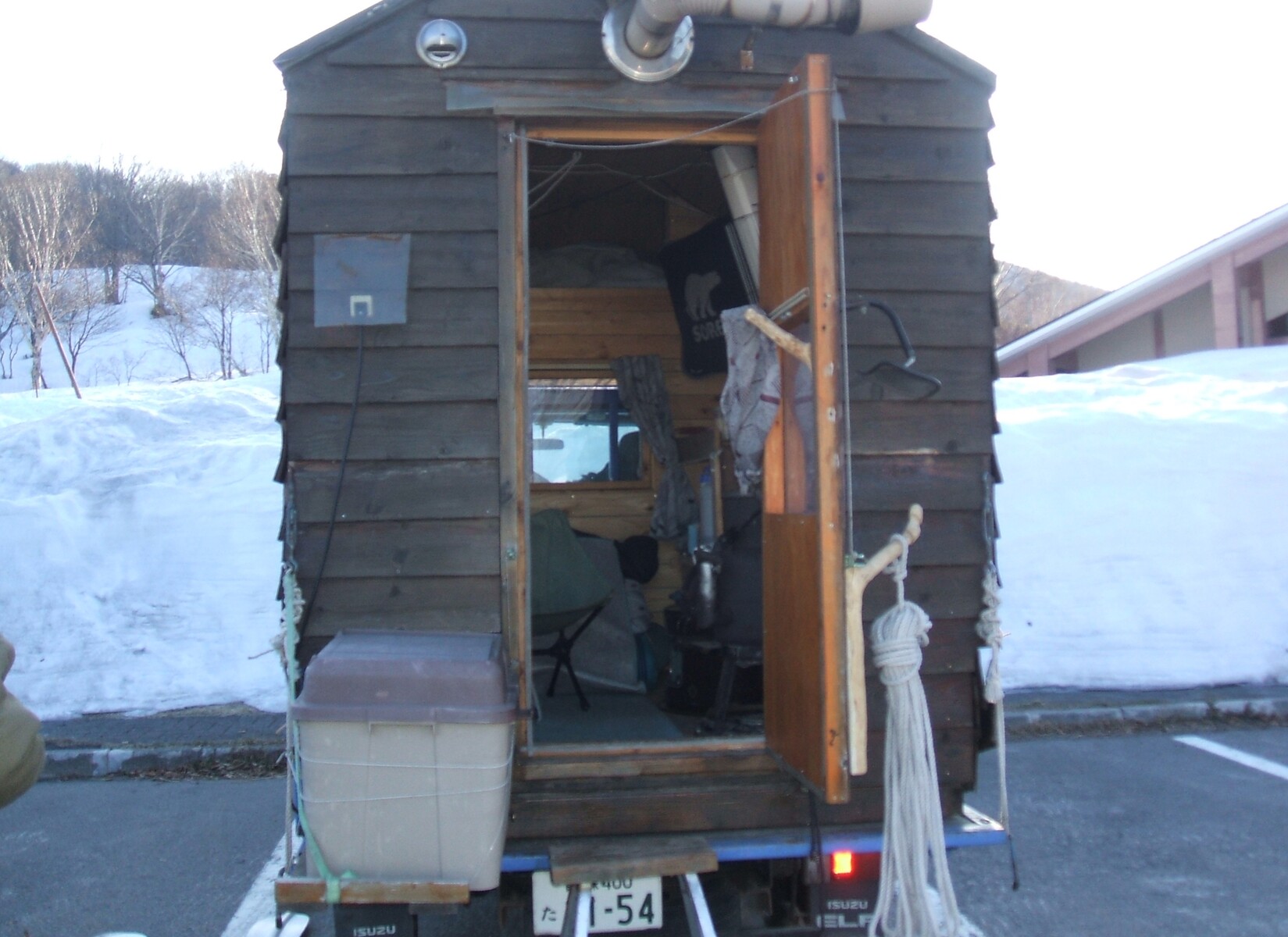 椅子で飲みながら景色を見てると、超目立つ車が来た。トラックに手製の家が乗ってる。