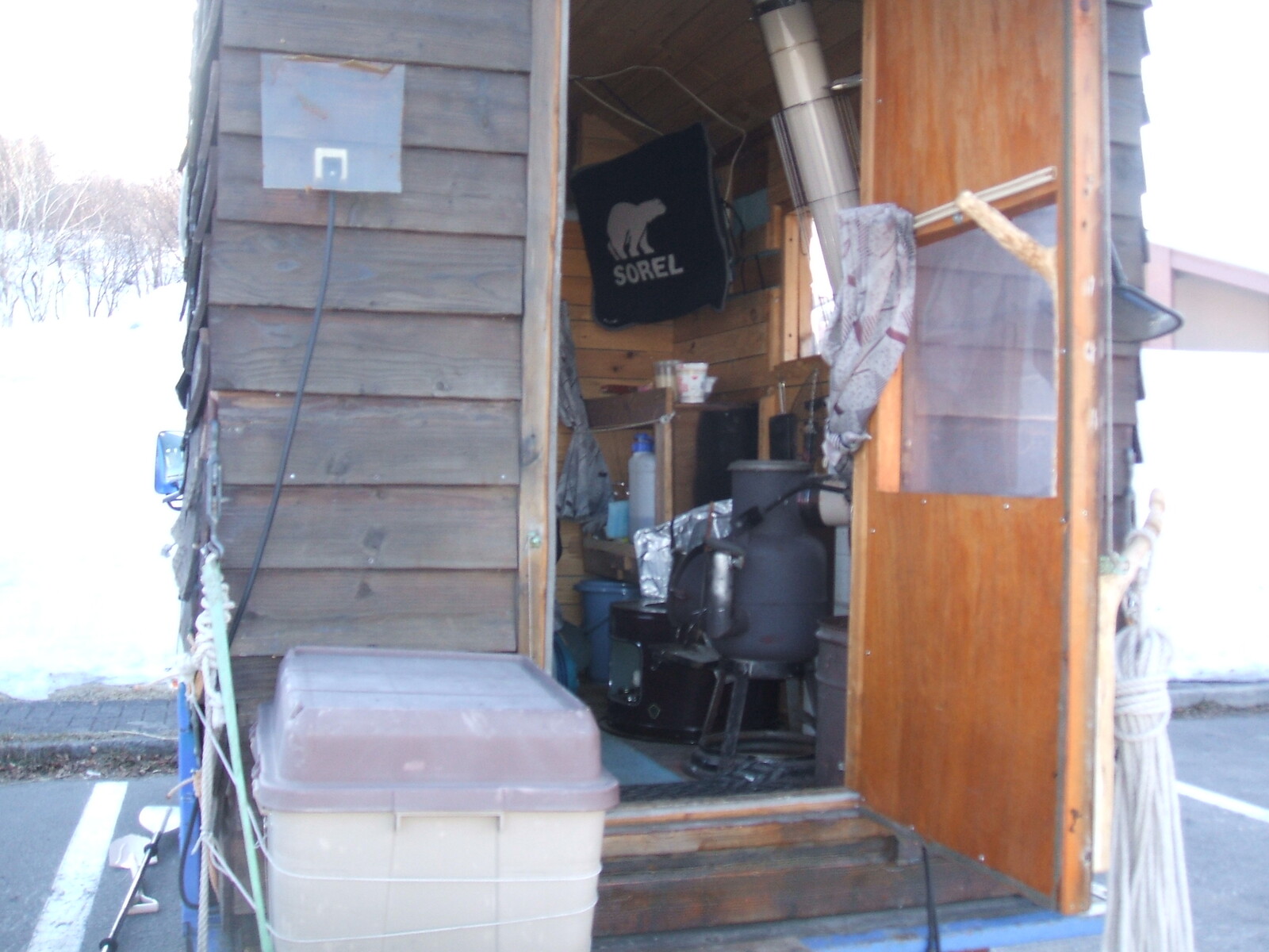 何と、プロパンガスボンベで造った薪ストーブまで・・・煙突が屋根から出てる。
