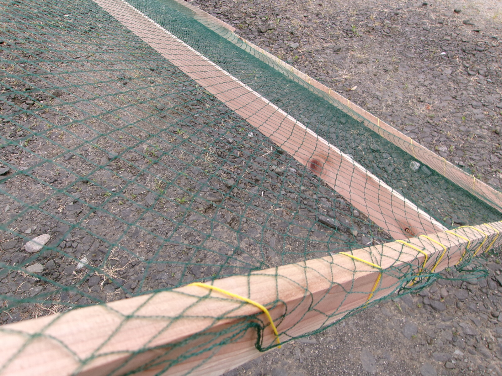 100均で買った、2m×2m・網目2㎝角の防鳥ネットを、水糸で絡めます。