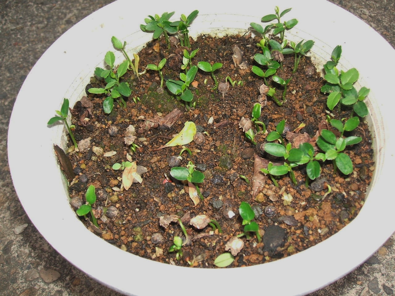 庭木の柘植だが、昨年の冬前に採った実を、鉢に蒔いておいたのが発芽し始めた。