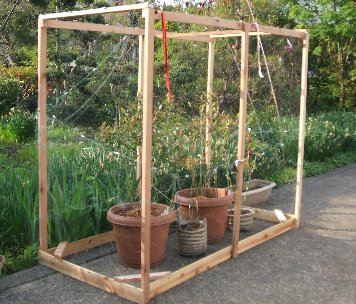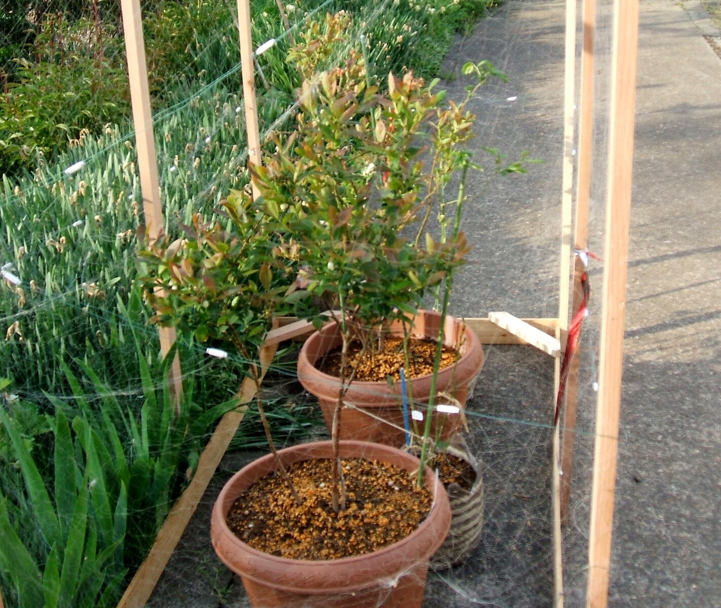 蔓が出始めたので、今日ネットを張る。昨年強風で倒れ掛けたので、今年は支えで補強。