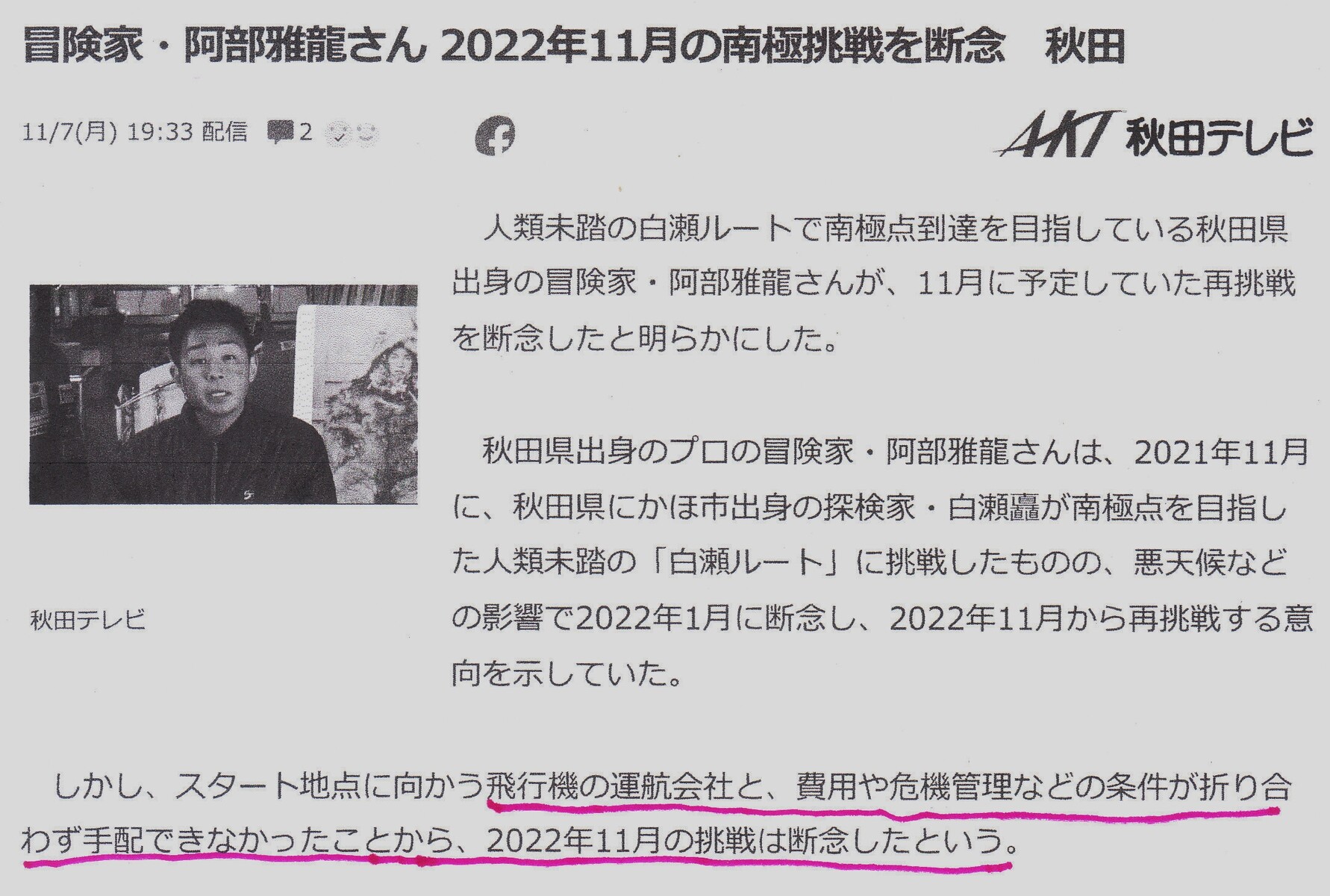 阿部さんは出発から31日目の出来事として、FBに「食料補給地点を通過。(中略)僕もここで補給を受ける。(中略)決断をするのは楽ではなかった」と記した。最後に「雪の状況は飛躍的に変わるはずだ。絶対に行くんだ、南極点!」と綴った。